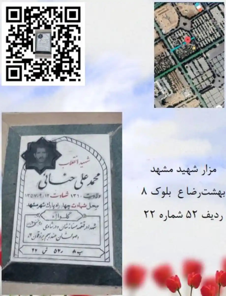 | مزار شریف | مشهد، بهشت رضا، بلوک ۸، ردیف ۵۲، شماره ۲۲ |