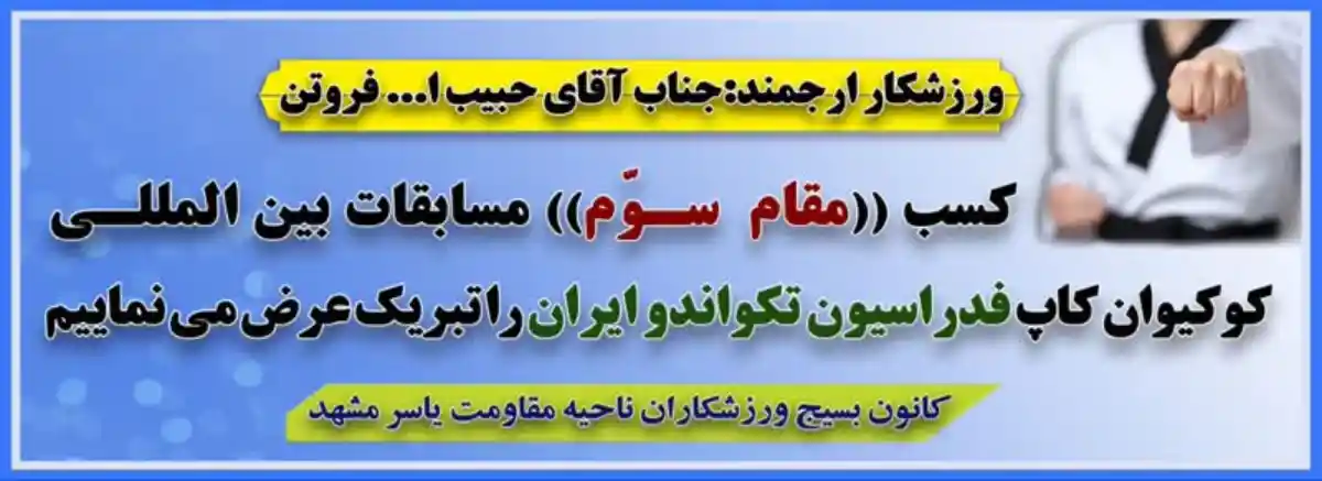 حبیبالله فروتن، بسیجی ورزشکار ناحیه یاسر، موفق به کسب مقام سوم در مسابقات بینالمللی کوکیوان کاپ فدراسیون تکواندو شد. این رقابتها که با حضور قهرمانان جهان و سطح فنی بسیار بالا در تاریخ ۱۵ الی ۱۸ مهر ۱۴۰۴ به میزبانی استان اصفهان برگزار گردید، فرصتی ارزشمند برای ورزشکاران کشور بود.