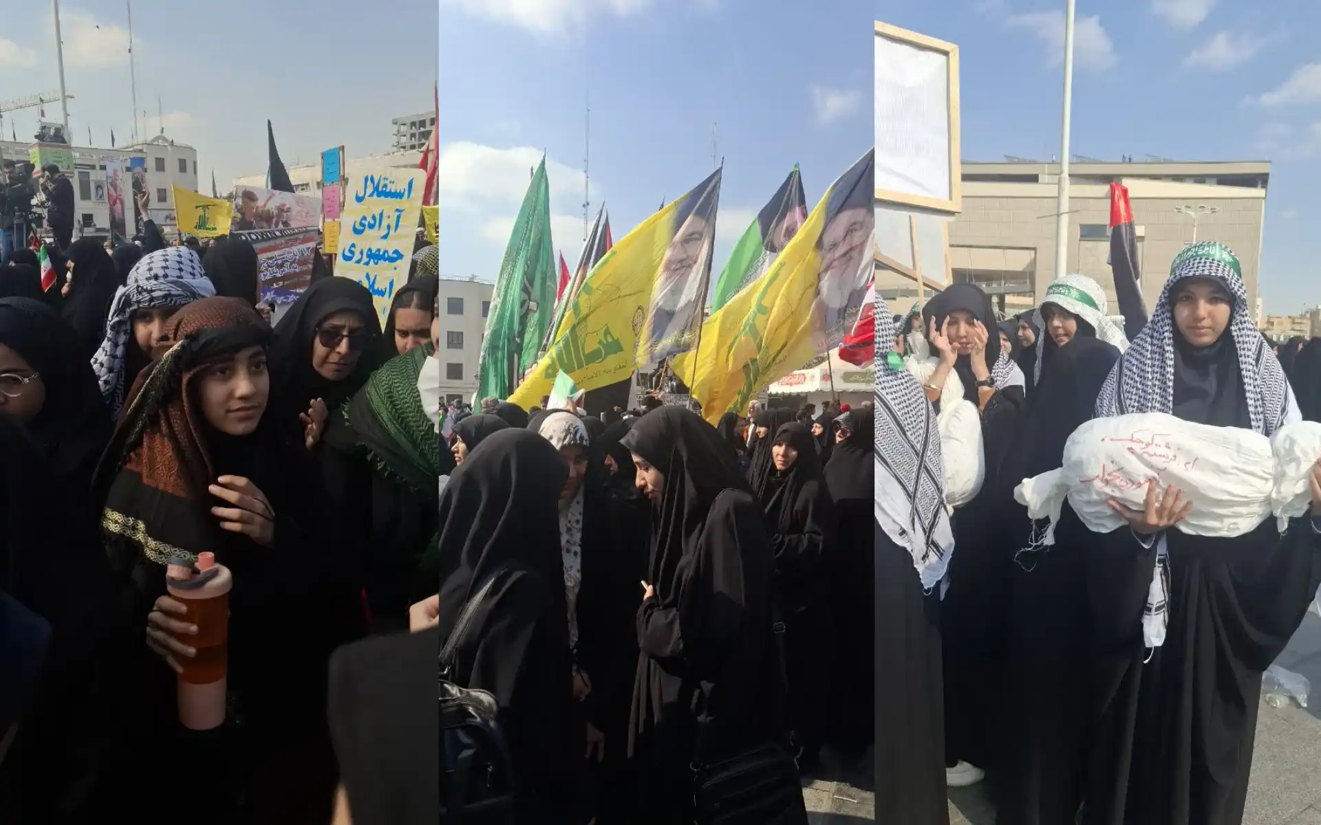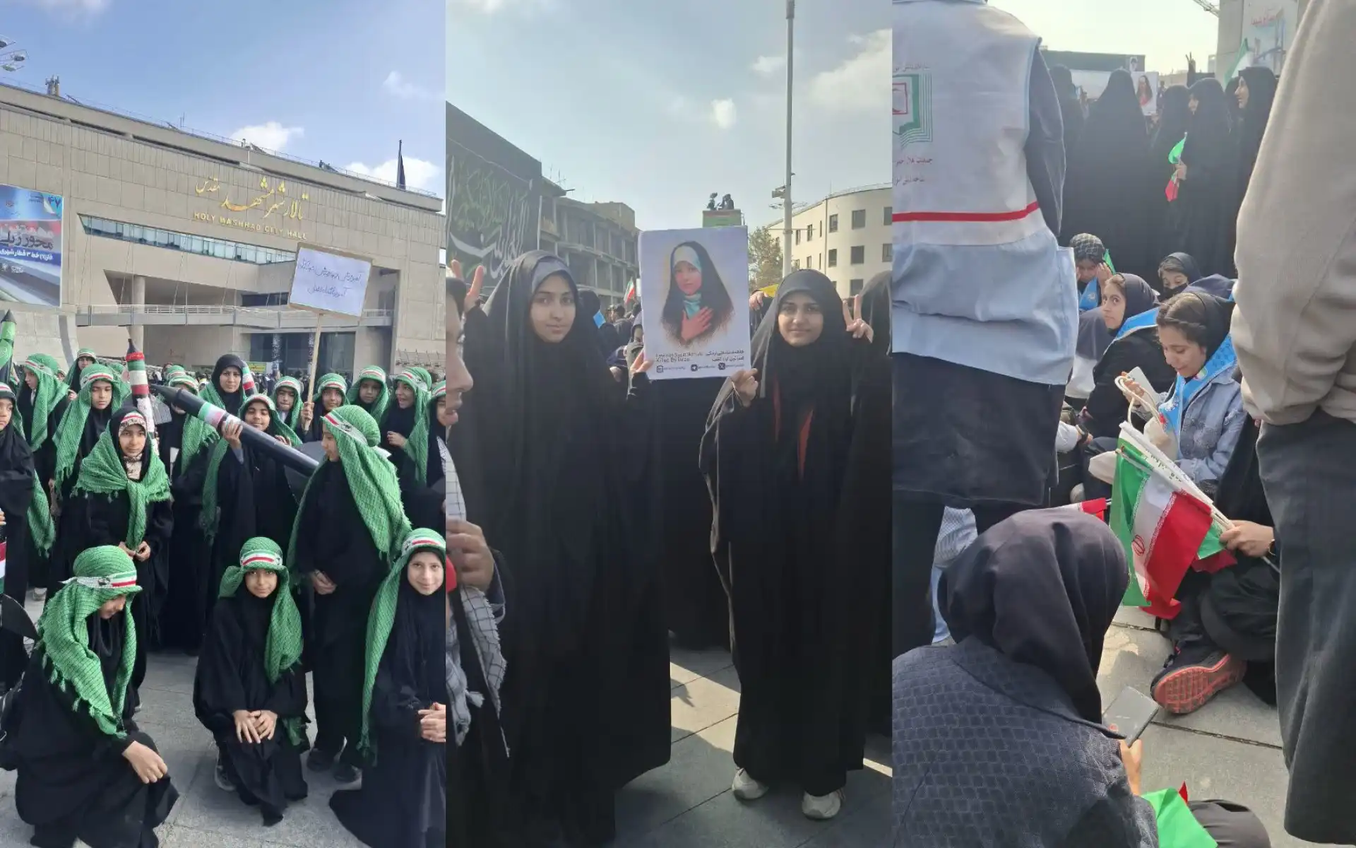 از چهار سوی میدان، صفوف منظم دانشآموزان دختر و پسر با پرچمهای ایران و فلسطین، چفیههای بسیجی و پلاکاردهای مدرسهای دیده میشد. در یک سوی میدان، پسران نوجوان با لباسهای بسیجی و ارتشی و در سوی دیگر، دختران دانشآموز با شالهای مزین به پرچم ایران و فلسطین صف کشیده بودند.